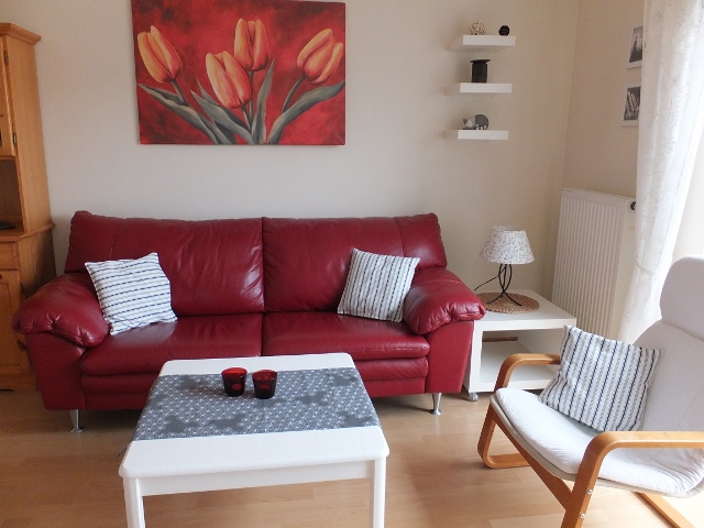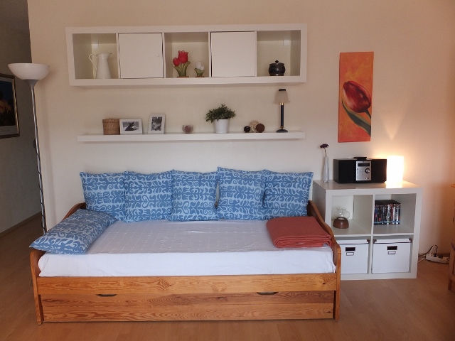 Im Wohnzimmer befindet sich zusätzlich ein ausziehbares Kojenbett mit zwei Matratzen