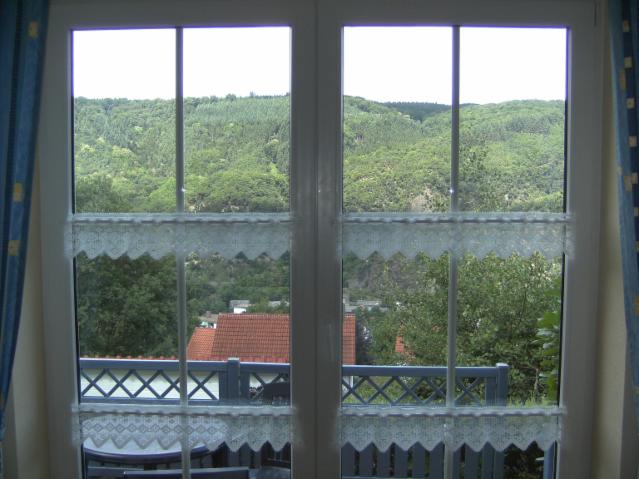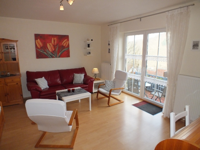 Vom Wohnzimmer aus haben Sie Zugang zur sonnigen Terrasse mit Aussicht über das Lahntal.
